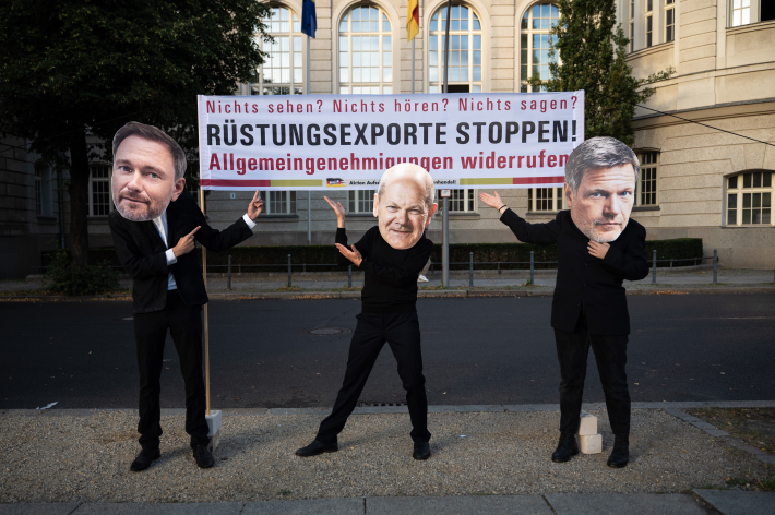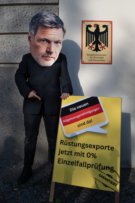 Das Motto der Aktion kritisierte die damit verbundene, nochmals verschlechterte Kontrolle und Transparenz bei Rüstungsexporten. Deswegen stellten drei Personen mit Masken Bundeskanzler Scholz, Wirtschaftsminister Habeck und Finanzminister Lindner dar, die sich Augen, Ohren und Mund zu halten, in Anlehnung an die drei Affen, die nichts sehen, hören und sagen. Als „Effizienzsteigerung“ verharmlost, werden mit diesen Allgemeingenehmigungen die Einzelfallprüfungen sowie die Endverbleibserklärung für eine Reihe von sonstigen Rüstungsgütern abgeschafft.